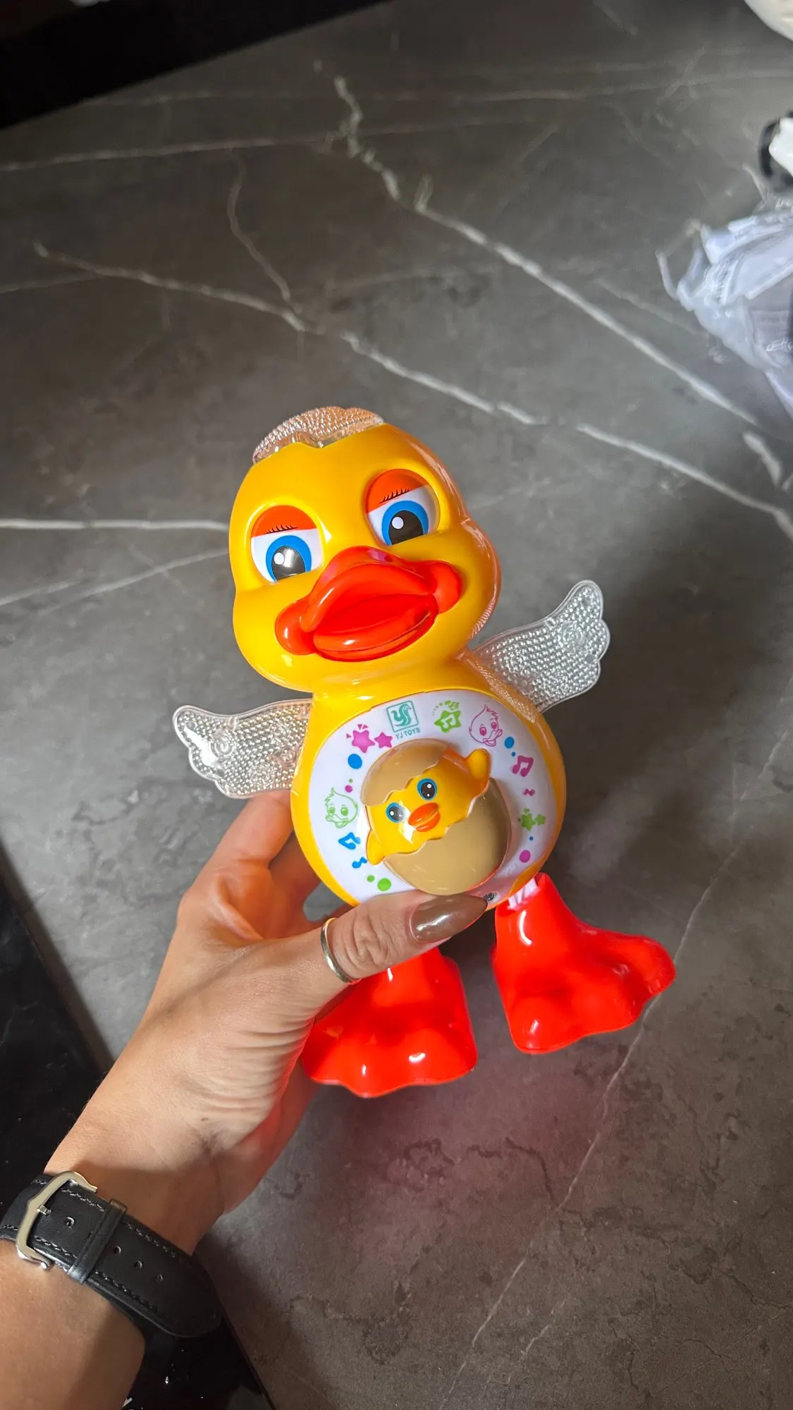 O pato se mexe ao som da música enquanto as luzes piscam, tornando a brincadeira mais envolvente e estimulante para os pequenos.